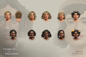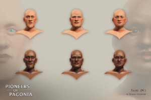 We wanted different faces for each randomly generated Pagonian. To save resources while still accounting for ethnicities, we needed faces which would look plausible no matter the skin tone. I also wanted to give each a different character so they would be distinguishable.